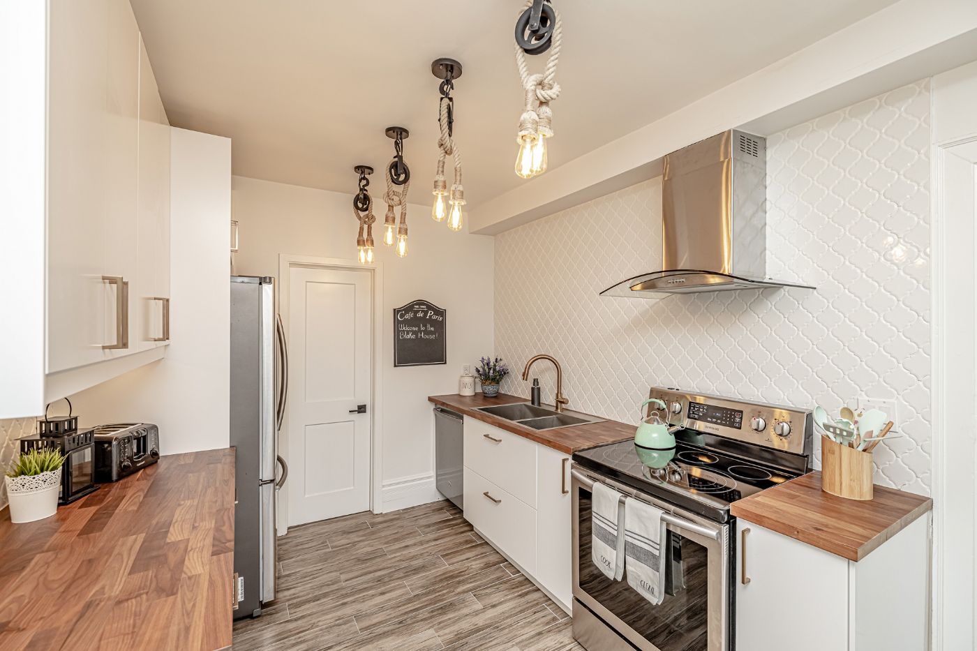 Main floor Features a modern kitchen with new appliances and attached 3-piece bathroom. Bright and airy open concept living/dining room with gas fireplace and Art Deco light fixtures.