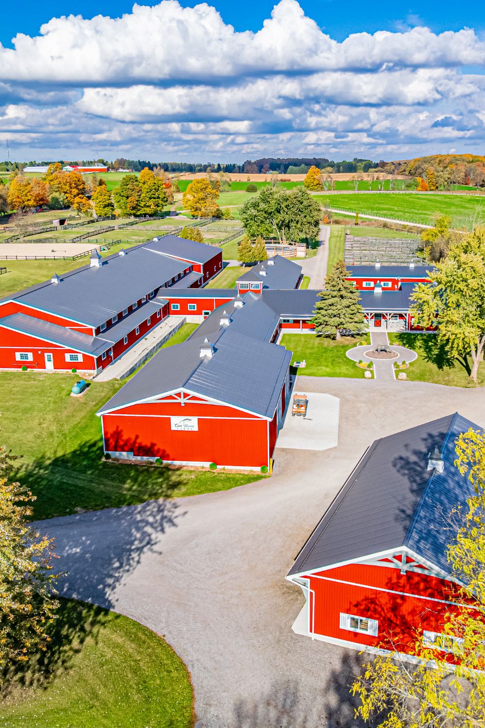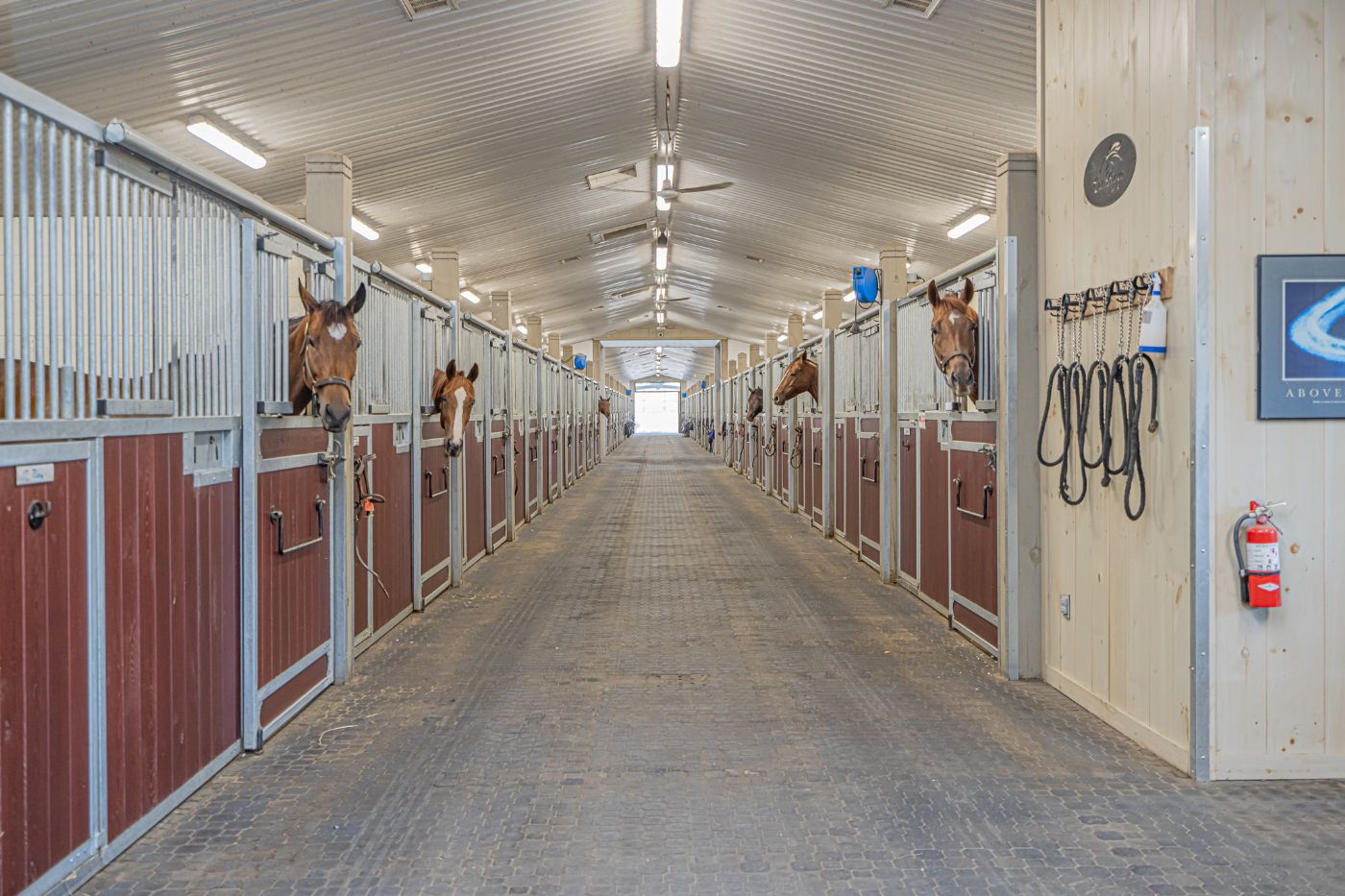 Broodmare barn - designed for safety and supervision, 9 large bright stalls, 2 can be converted to 12x24 for foaling season. Storage, office, washroom, cameras.