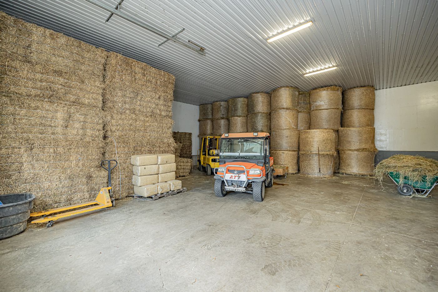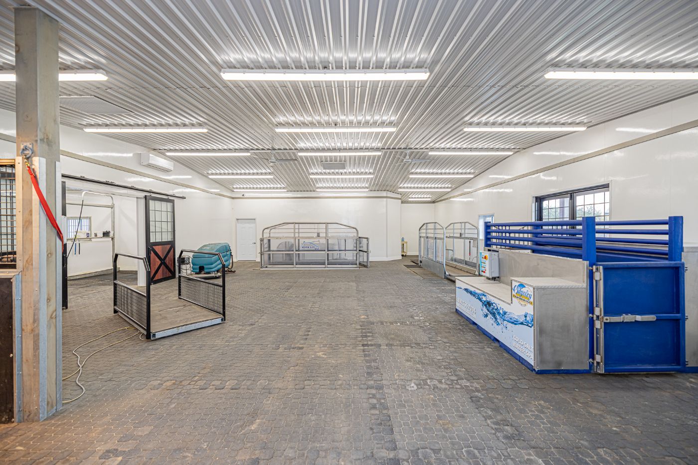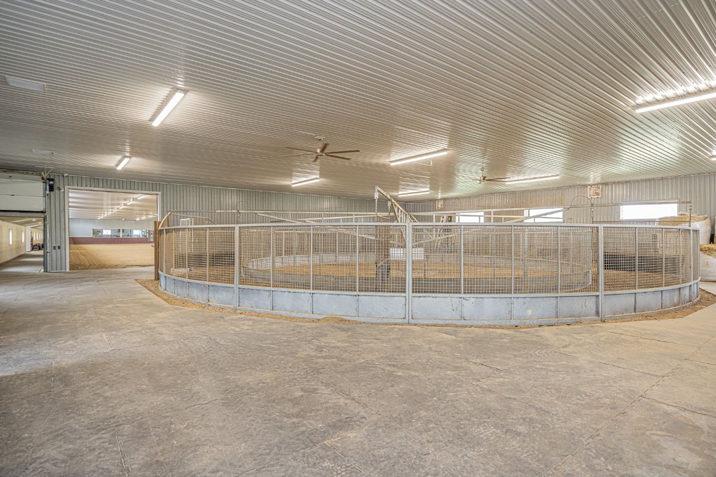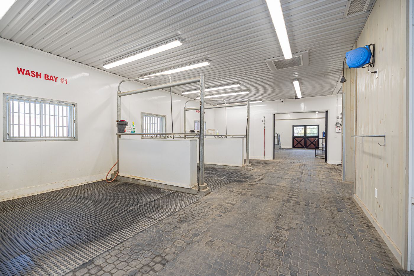Main barn - professionally designed ventilation system, so no dust or smell, wide aisles with heated floor and rubber mats, wash racks, tack rooms, feed storage, office space and staff apartment. Storage for 300 round bales and easy access for a tractor to take to the paddocks or into the barn. 16 foot high door in storage area makes for easy delivery of hay/feed.