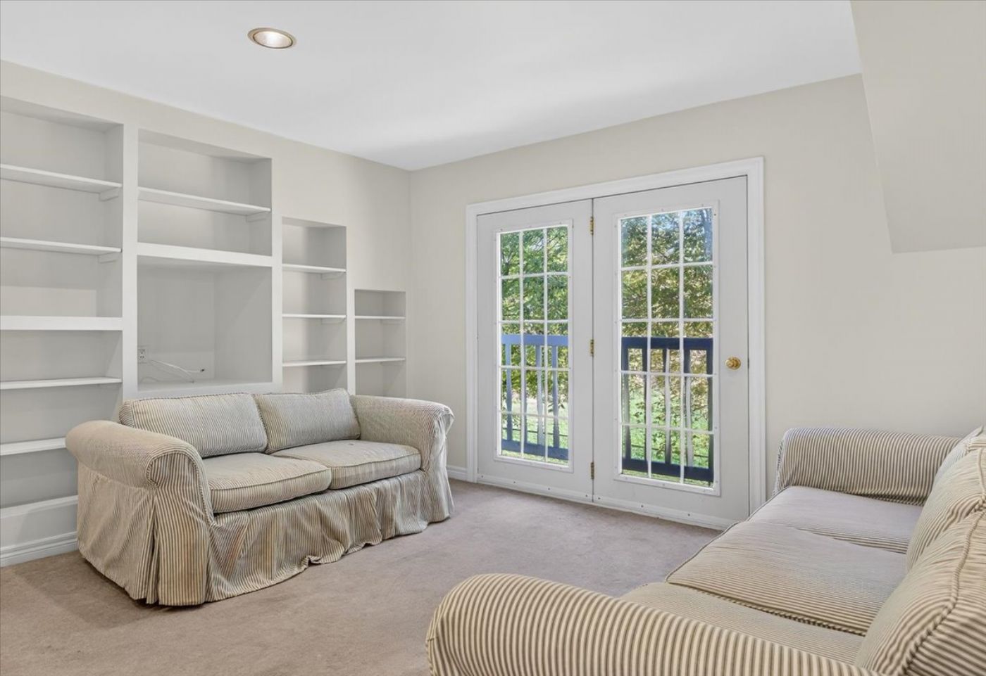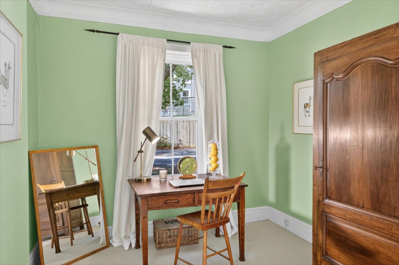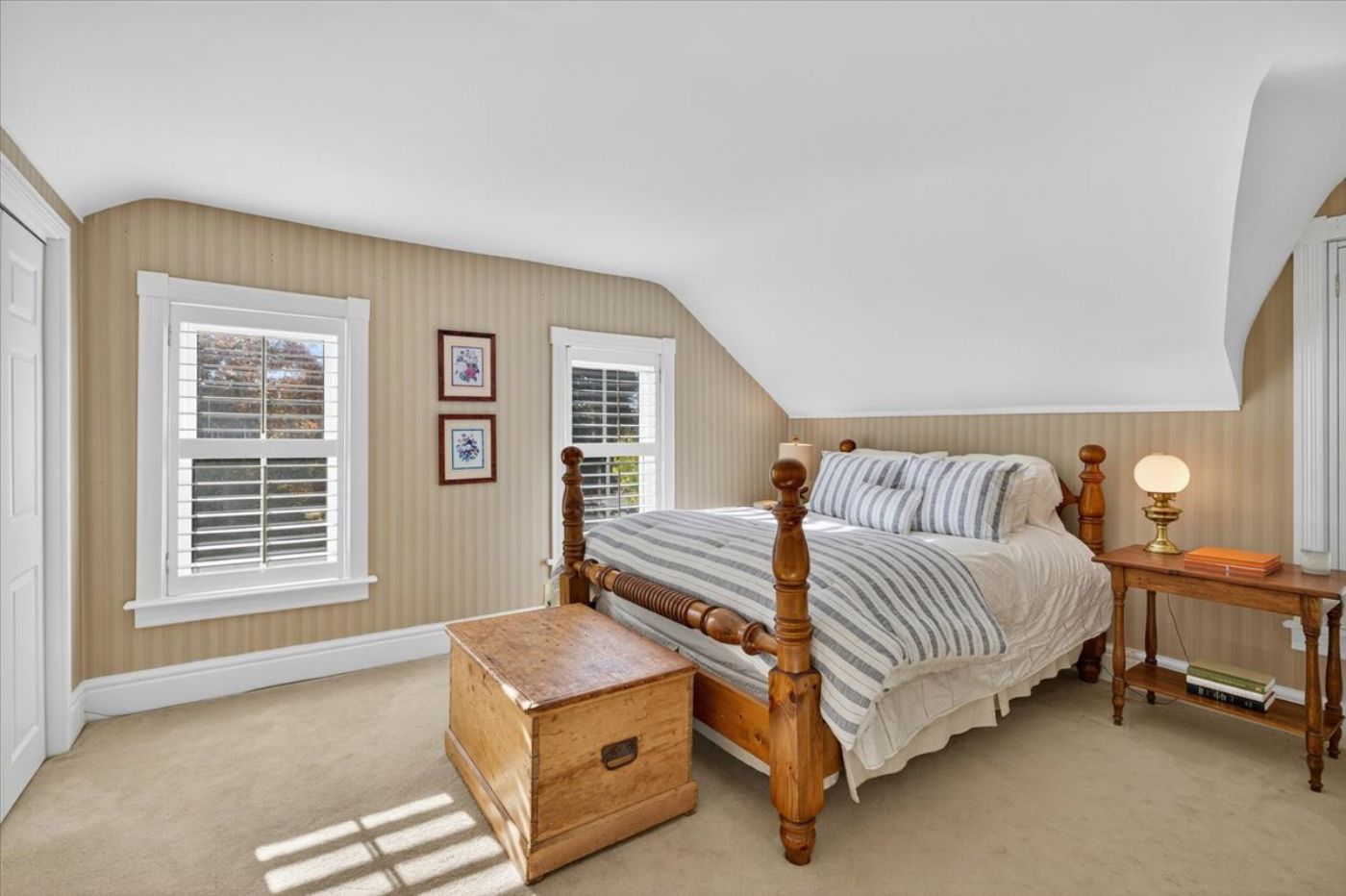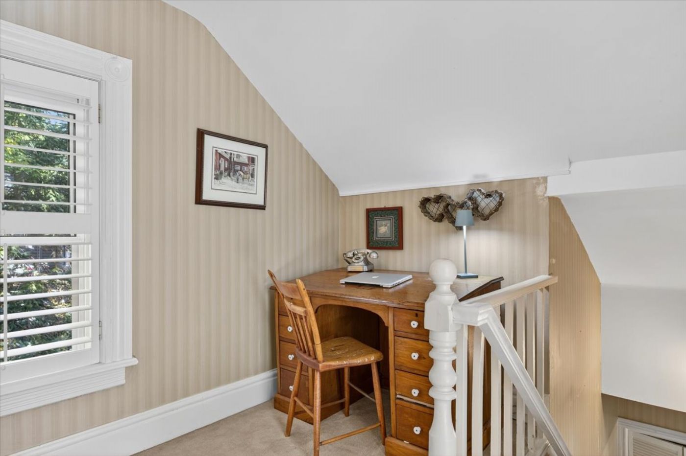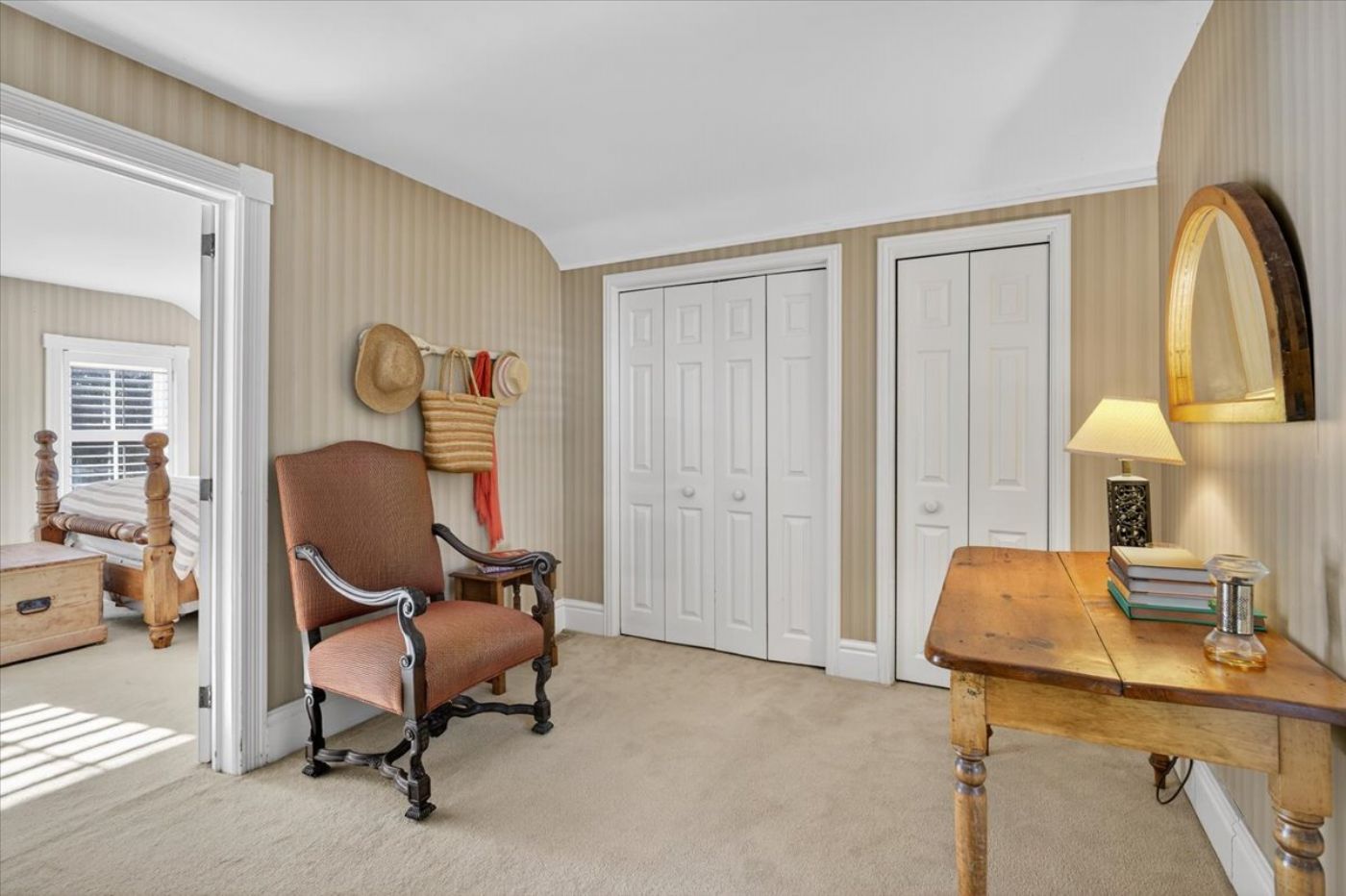 Upstairs a serene primary bedroom with an expansive dressing area or office.