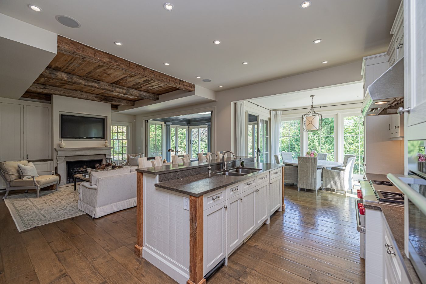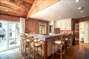 Located in the centre of the home, the kitchen is combined with the living room. The over-sized fireplace, beamed ceiling and views to the east make this a wonderful space. The kitchen has top-of-the-line appliances, multiple prep spaces and breakfast bar.