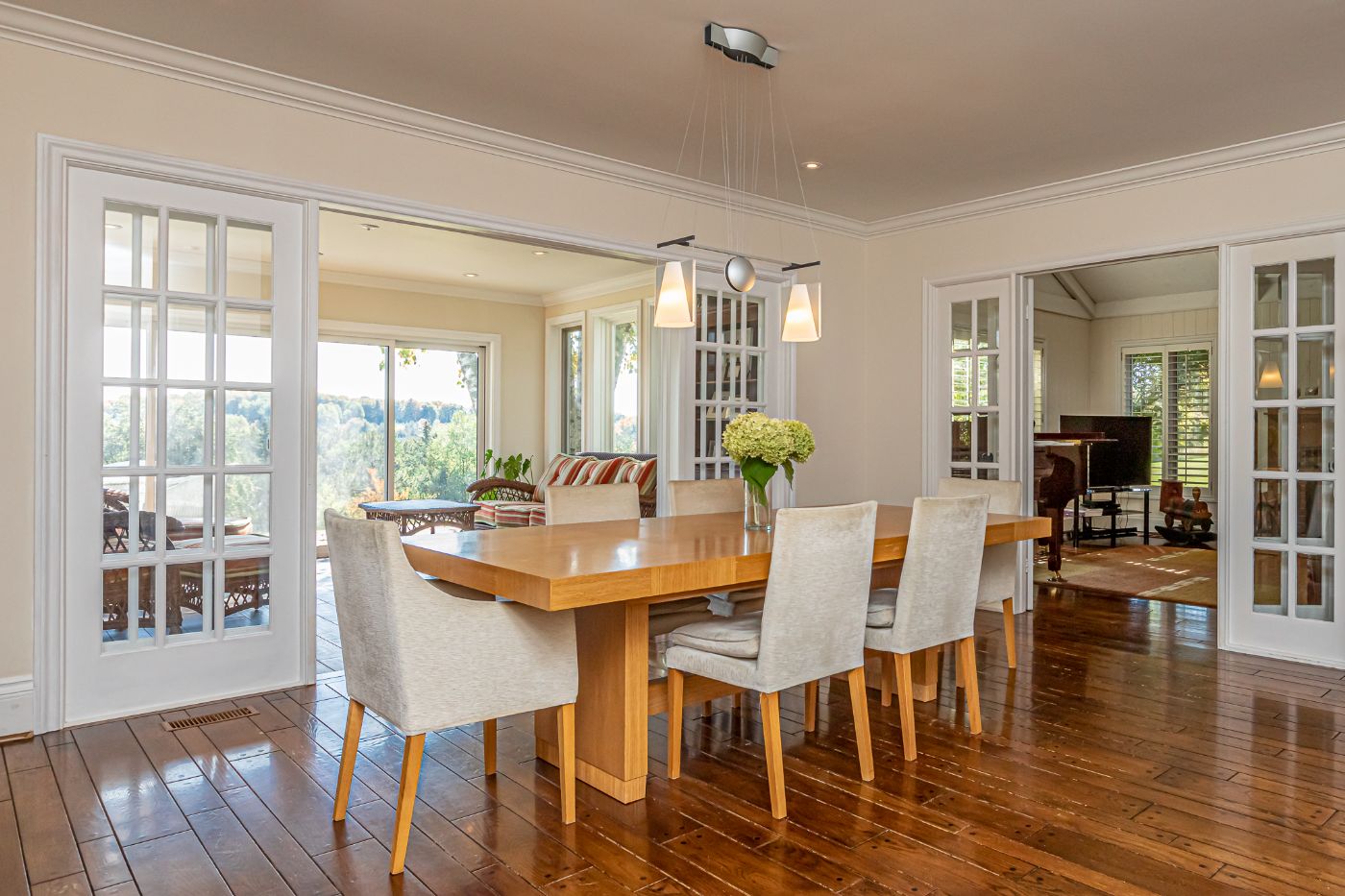 The Dining Room is centrally located in the floor plan. Pegged oak floors, halogen pot lighting, walk-out to screened sunroom (4.85 x 4.30 m) perfect for extended entertaining, spectacular views, access to gardens.