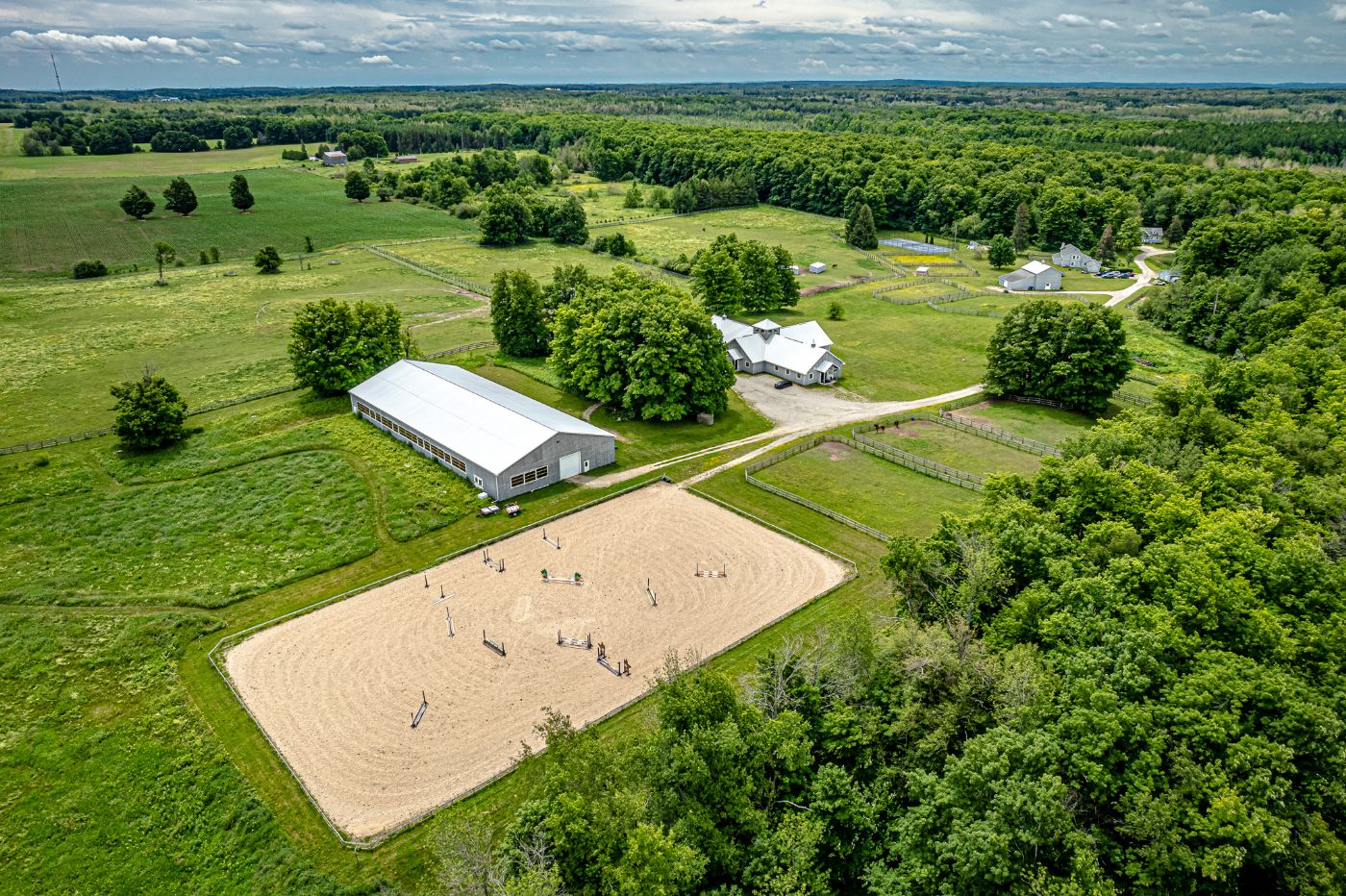 A recently built 12-stall barn with central foyer. This state-of-the-art facility has 2 grooming stalls, 2 wash stalls, washroom, large tack room, office, laundry, feed room and multiple storage rooms. An elegant stable reminiscent of the classic New England barns.