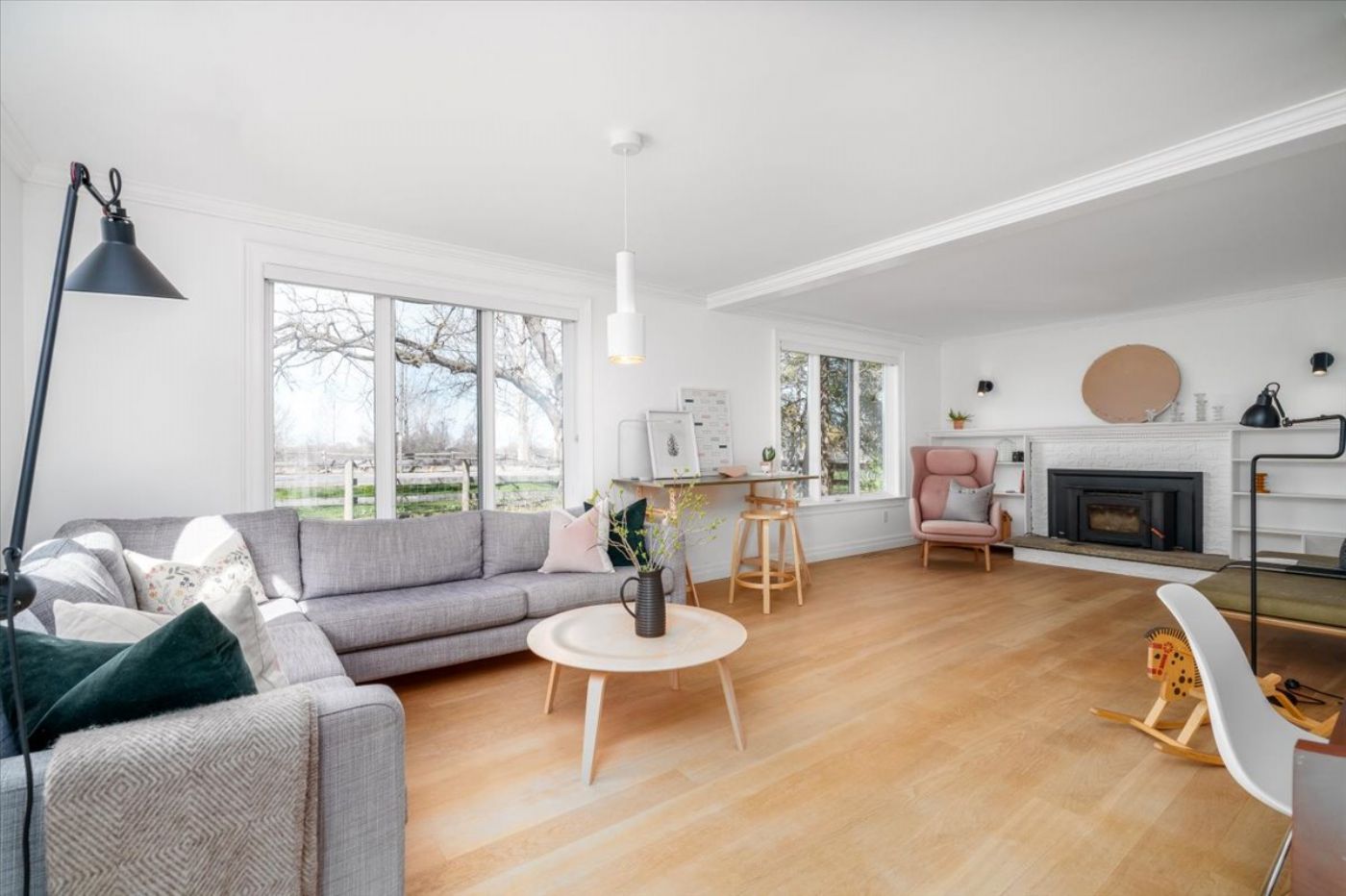 This home has undergone a transformation into a light-filled country home with 3 bedrooms and 3 bathrooms. The main level has a wonderful floor plan where the eat-in kitchen overlooks the great room with fireplace and exposed timber walls. At the front of the home is the living room with fireplace, hardwood floors and countryside views.