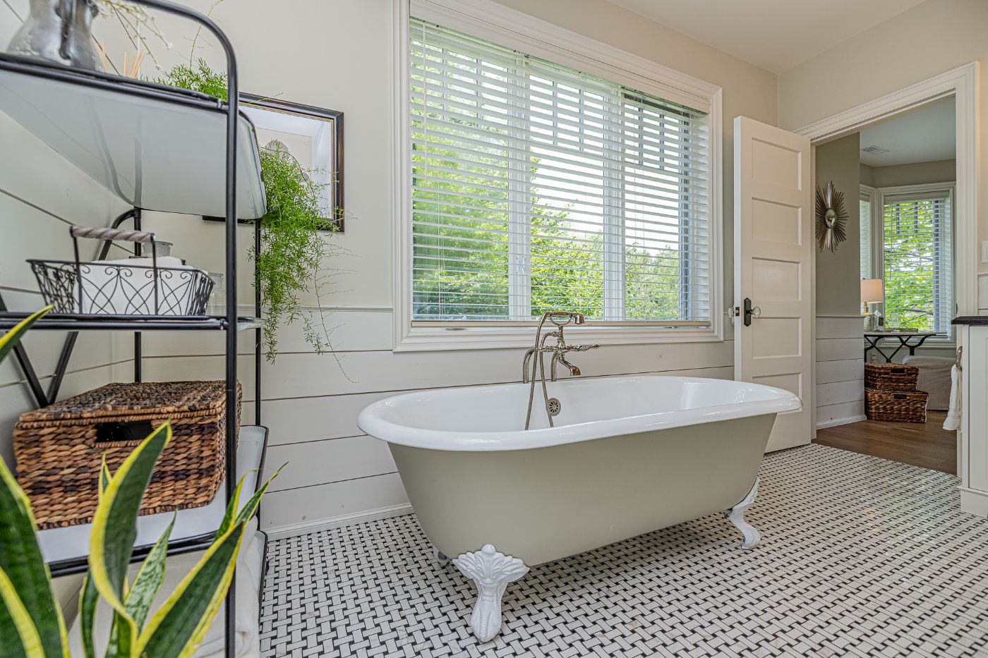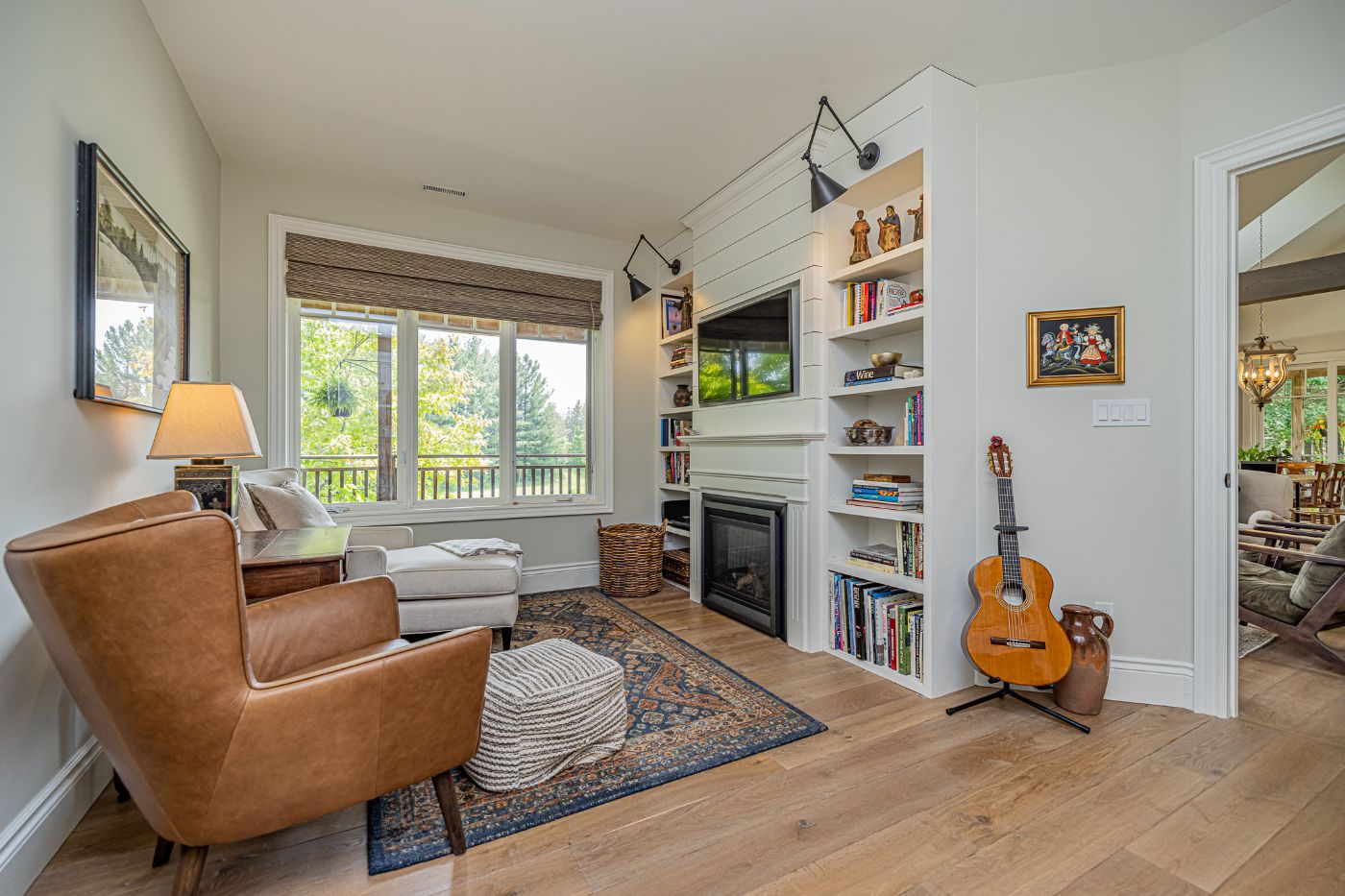 The main floor has a country home feel with wide plank white oak flooring, wood-burning fireplace with custom brick surround and 150 year-old hand hewn wood mantel along with large expanses of glass offering picturesque views especially when visited by local wildlife.