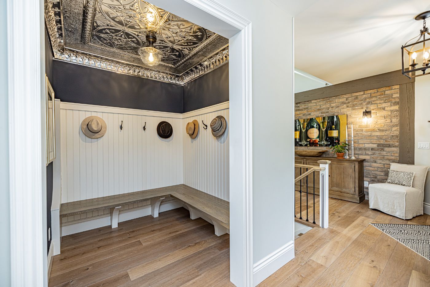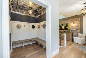 Also on this level is a powder room, a bright over-sized laundry room and a coat room with custom tin ceiling in addition to a mudroom with heated floors and custom cabinetry.