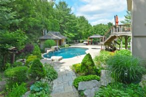 On the north side of the pool is a pool cabana with change room and pool equipment room. The cabana overlooks the Gunite pool designed and built by Todd Pools.