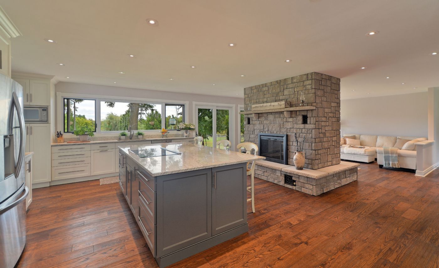 Set far back and hidden from the road, the new driveway leads you up to this newly renovated 3 bedroom brick bungalow with a designer kitchen, massive double-sided stone fireplace and large entertaining areas.