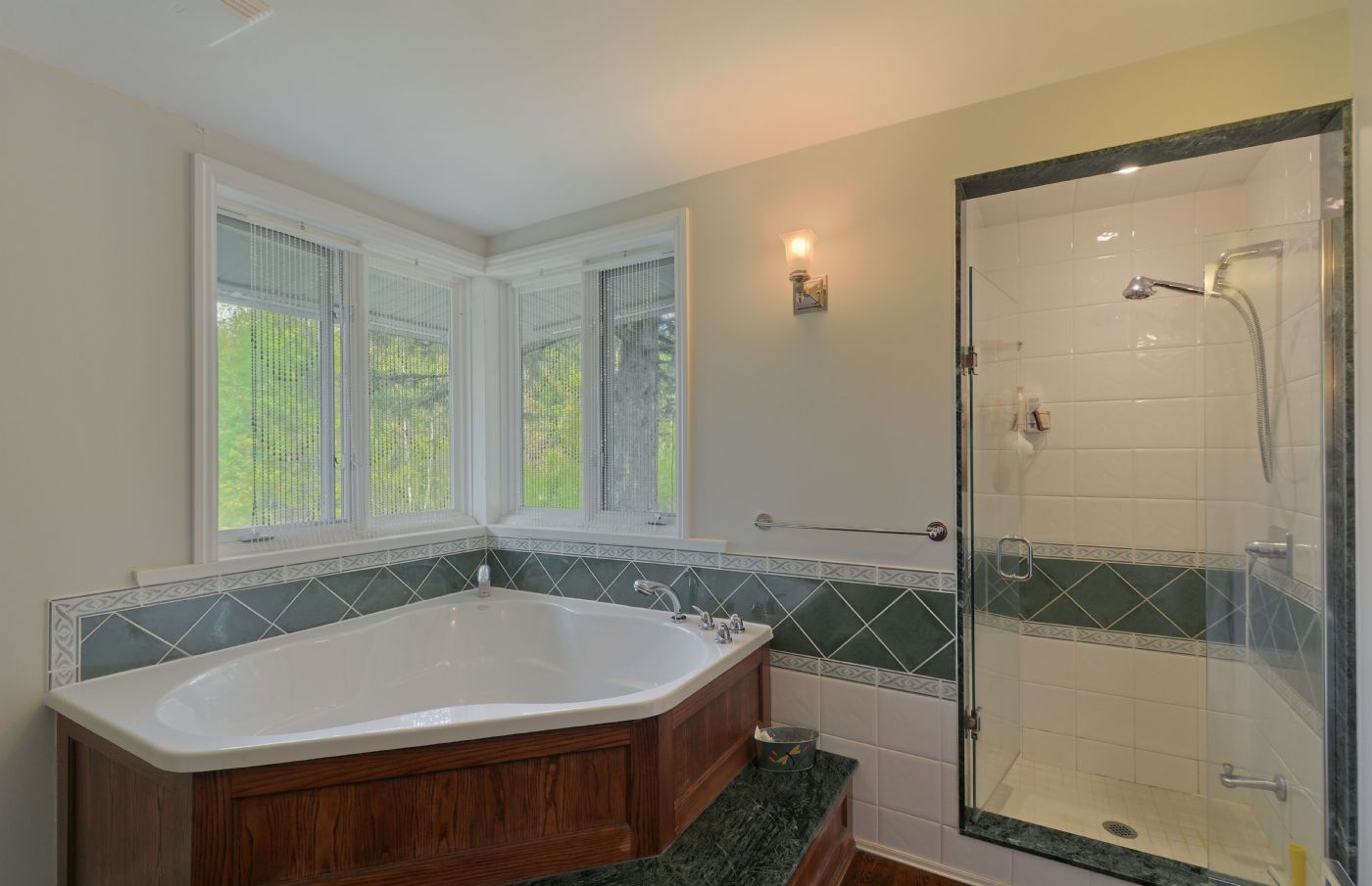 Large living room has a wall of windows to take advantage of the westerly views and includes a substantial fieldstone fireplace, cathedral ceiling and pegged oak flooring.  The dining room is open to the living room and provides an interesting space for entertaining.