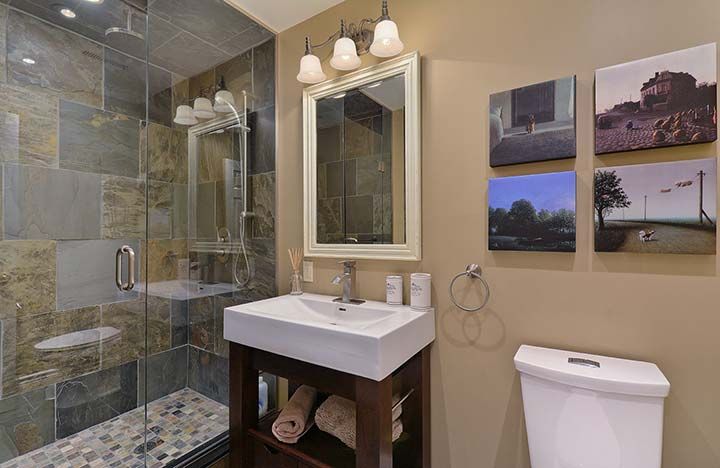 3-Piece Guest Bathroom with glass shower and slate floors