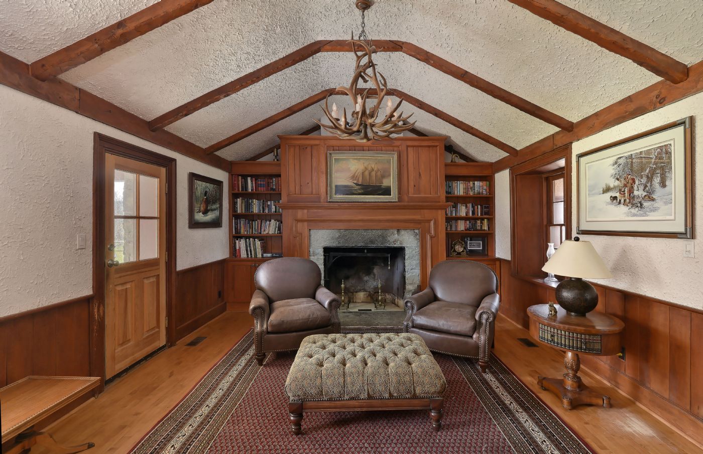 Perhaps the main feature of the library is the pioneer era stone fireplace with stone hearth. Panelled wainscoting, built-in book cases and a cathedral beamed ceiling make this a favorite room in the home.