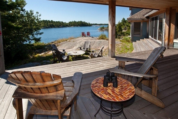 The project consists of a main three bedroom cottage and a two bedroom sleeping cottage both sited on high ground overlooking a perfectly protected harbour with a natural sand beach. The structures were built with the view to withstand the weather extremes of the Georgian Bay climate: concrete based siding guaranteed for 50 years, high quality stains with a 15 year guarantee, chimneys built entirely of local cut stone granite and double hung custom Thermopane windows throughout.