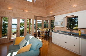 The main cottage (approximately 2,400 sq. ft.) a compilation design effort with the owner and James MacDonald, Architect, is irregularly shaped with the an open plan living-dining-kitchen pod connected to a 3 bedroom sleeping pod by a long screened porch with sliding glass panels. The entire space is flooded with natural light..........this airy quality is further enhanced by the clear maple flooring, the blond pine wall paneling and the alabaster uplighting.